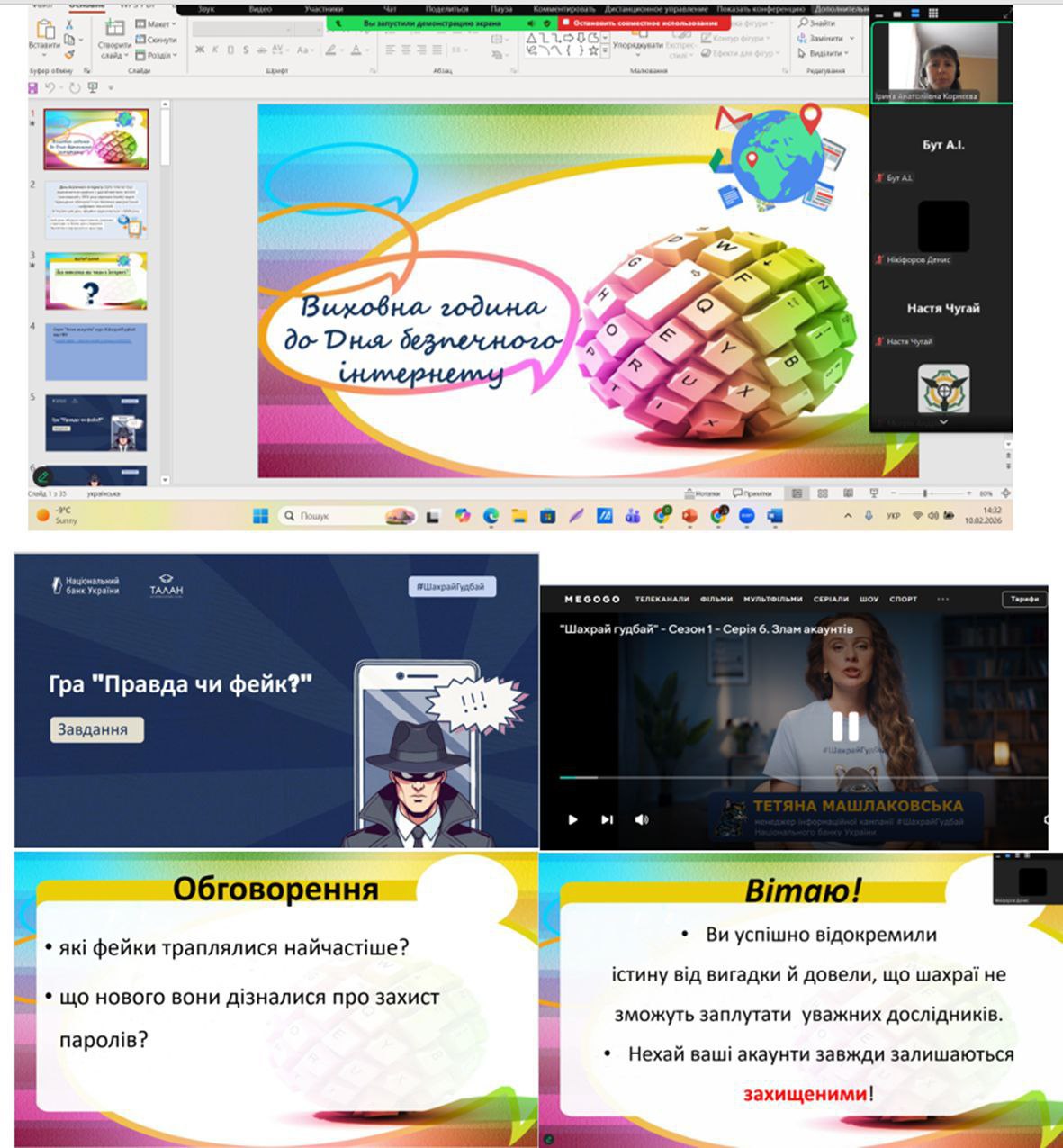З метою підвищити обізнаність про кіберзагрози та захист персональних даних класним керівником ПЗ-11 Корнєєвою І.А. була проведена відкрита виховна година до Дня безпечного інтернету. Студенти ознайомилися з історією цього дня. Переглянули серію "Злам аккаунту" з курсу #ШахрайГудбай від НБУ. А також спробували себе у ролі детективів кібербезпеки в інтерактивній навчальній грі з з елементами