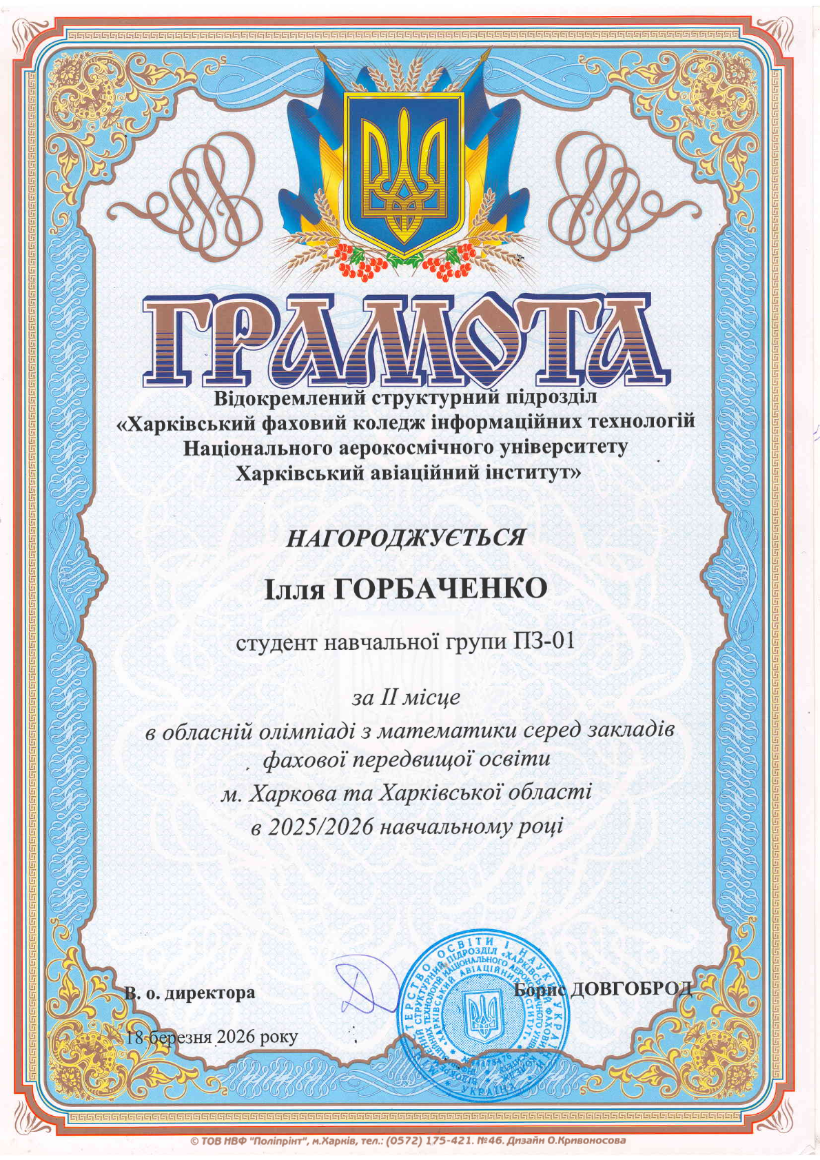 18 березня 2026 року відбувся ІІ тур обласної олімпіади з математики серед здобувачів освіти закладів фахової передвищої освіти м. Харкова та Харківської області 2025-2026 навчального року. Наш коледж гідно представив студент навчальної групи ПЗ-01 Ілля Горбаченко, який посів друге місце. Вітаємо Іллю з почесним другим місцем та бажаємо подальших успіхів. |