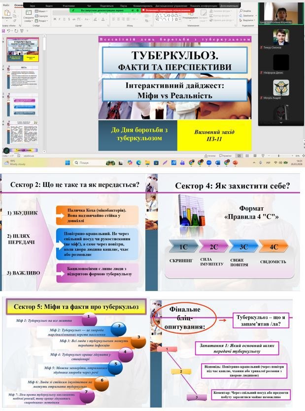 26 березня у групі ПЗ-11 була проведена виховна година до Дня боротьби з туберкульозом. Метою заходу було підвищити рівень обізнаності студентів про туберкульоз, розвінчати поширені міфи. Студенти навчилися розпізнавати симптоми хвороби та визначили основні способи захисту, дізналися про важливість профілактичних оглядів та необхідність зміцнювати імунітет. Наприкінці класної години здобувачі успішно пройшли фінальне бліц-опитування.