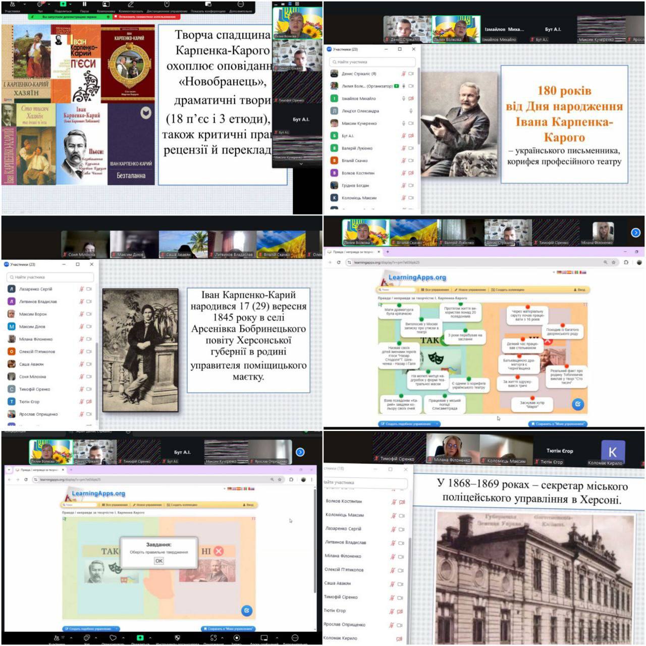 30.09.2025 року у групі БІС-11, під керівництвом класного керівника Лілії Волкової була проведена літературна година до 180-річчя з Дня народження Івана Карпенка-Карого - видатного українського письменника, корифея українського театру. Здобувачі освіти занурилися у театральне життя ХІХ ст., відкрили для себе нові факти з життя і творчості геніального драматурга. У підсумку закріпили знання, взявши участь в інтерактивній вікторині "Так чи ні", обираючи правильне твердження про митця