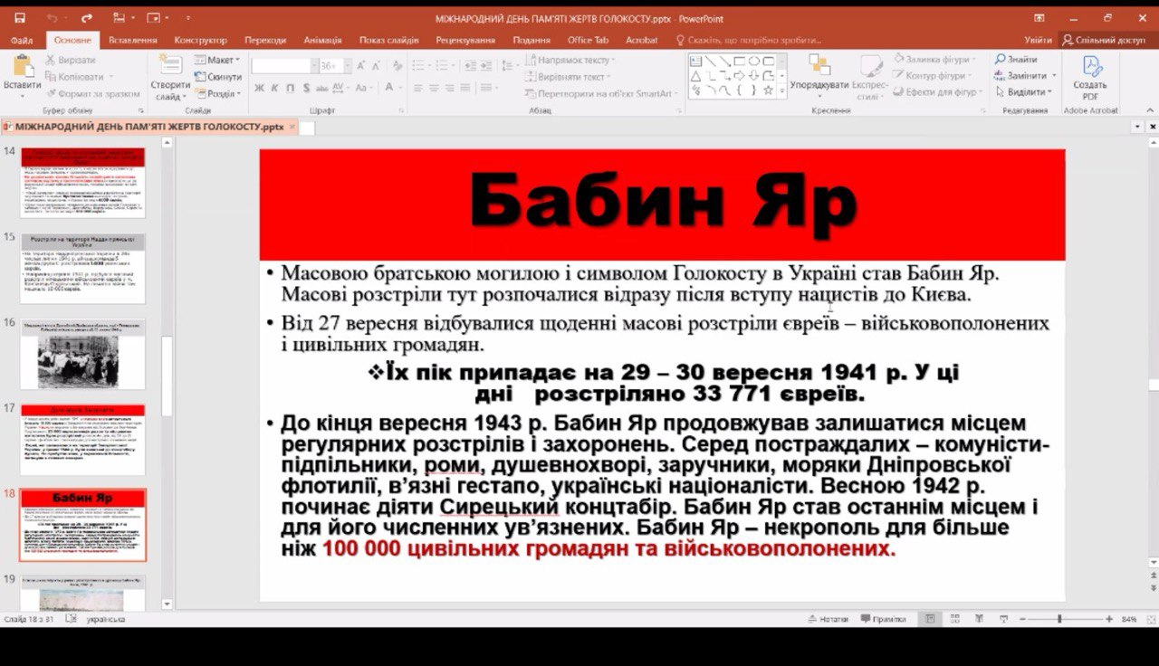Онлайн-година "НЕХАЙ НЕ ЗГАСНЕ ПАМ'ЯТІ СВІЧА" була приурочена до Міжнародного дня Пам'яті жертв Голокосту. Сергій Бутенко розповів про геноцид, спланований нацистсько-німецьким режимом, що призвів до винищення третини всіх євреїв, низки представників інших національностей. Нацисти знищили близко 6 мільонів євреїв, з яких понад півтора мільйона були з України. Літні люди, діти, немічні відразу потрапляли до газових камер.