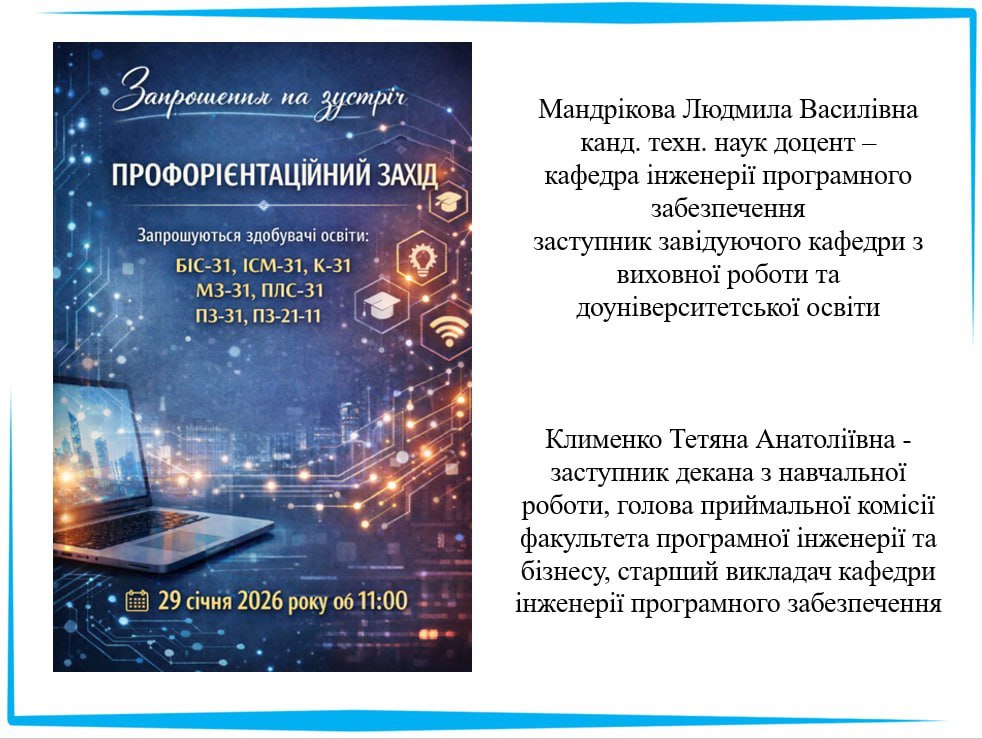 29 січня 2026 року в коледжі відбувся профорієнтаційний захід «Професійний старт випускника», спрямований на ознайомлення здобувачів освіти з можливостями подальшого навчання та професійного розвитку у сфері інформаційних технологій.