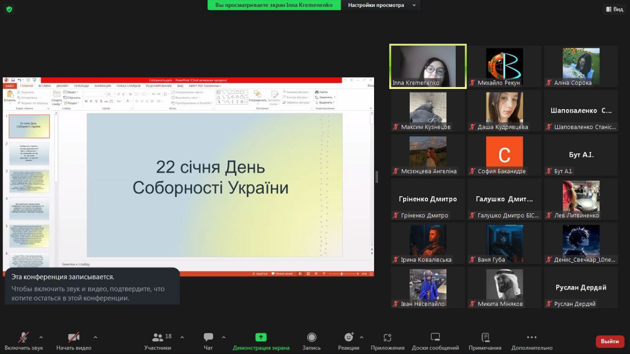 22.01.26 була проведена виховна година, присвячена знаковій події в історії нашої держави — проголошенню Акта Злуки. Саме 22 січня 1919 року на Софійському майдані в Києві здійснилася віковічна мрія: Західноукраїнська Народна Республіка та Наддніпрянська Велика Україна об’єдналися в єдину незалежну державу. Ми говорили з учасниками про суть Соборності, про історію боротьби, про символи єднання. Обговорили традицію «Живого ланцюга», який з 1990-х років символічно єднає береги Дніпра, Захід та Схід України. Під час заходу студенти виконували цікаві завдання: добирали слова-характеристики до кожної літери слова «Соборність» (Незламність, Об’єднання, Свобода тощо) та наповнювали наш символічний «Кейс побажань» для України. Найчастіше звучали слова: Перемога, Мир, Незалежність та Сила духу. Сьогодні соборність залишається нашим головним національним завданням. Справжня цілісність буде остаточно відновлена після звільнення кожного куточка нашої землі: від Криму до териконів Донеччини. Пам’ятаймо: лише разом, без поділу на регіони, ми зможемо збудувати сильну державу. Адже в єдності — наша сила!